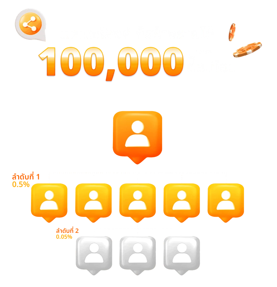 แนะนำเพื่อนลำดับที่ 1• ท่านจะได้รับส่วนแบ่งเริ่มต้นในดับที่ 1 0.5 ตัวอย่าง: ลูกค้าแทง 10,000 บาท ท่านจะได้รับ 50 บาท (ได้ทุกรายการแทงของลูกค้า)